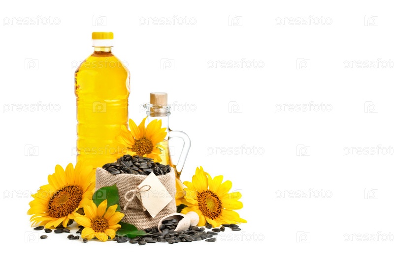 Красивый подсолнечник, подсолнечное масло и жареные семечки на белом фоне