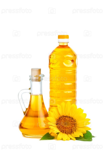 Красивый подсолнечник и подсолнечное масло на белом фоне