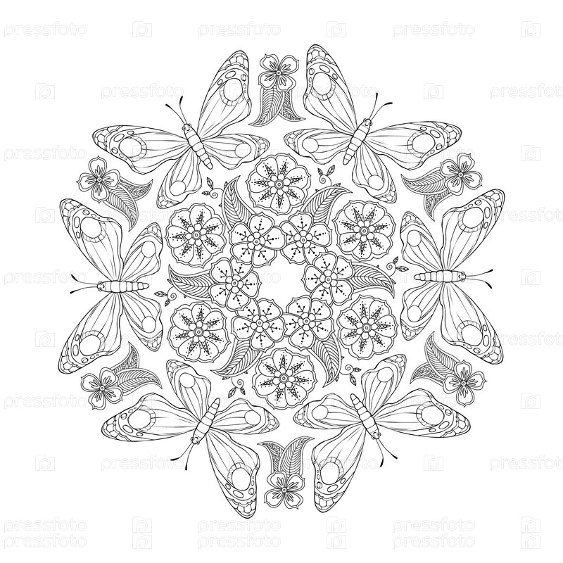 Мандала с бабочками и цветами