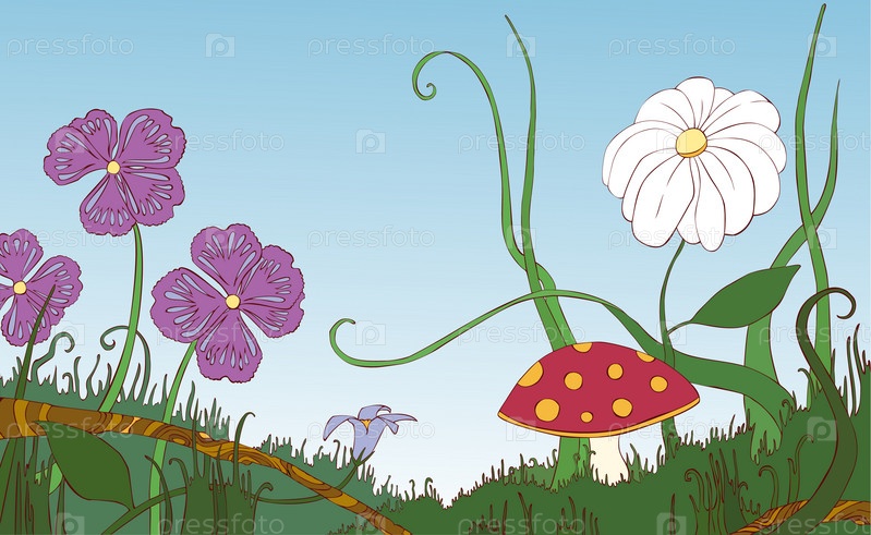 Цветы, травы и грибы на поляне