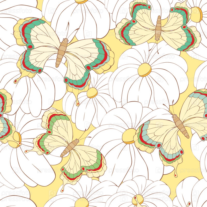 Бесшовный фон с бабочками и цветами