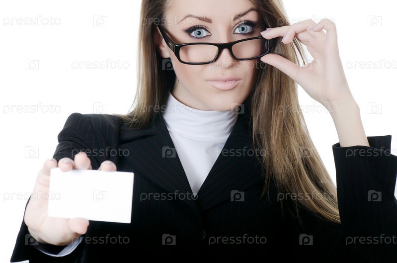 Деловая женщина с визитной карточкой изолирована на белом фоне