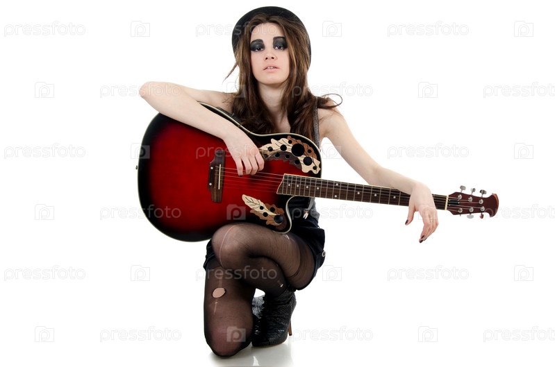Портрет красивой девушки с гитарой, одетой в стиле гранж
