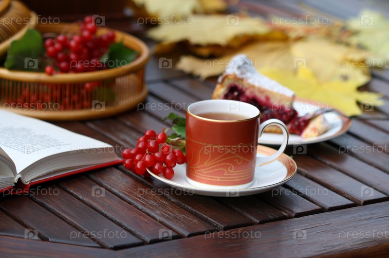Натюрморт с чашкой чая и веточкой калины