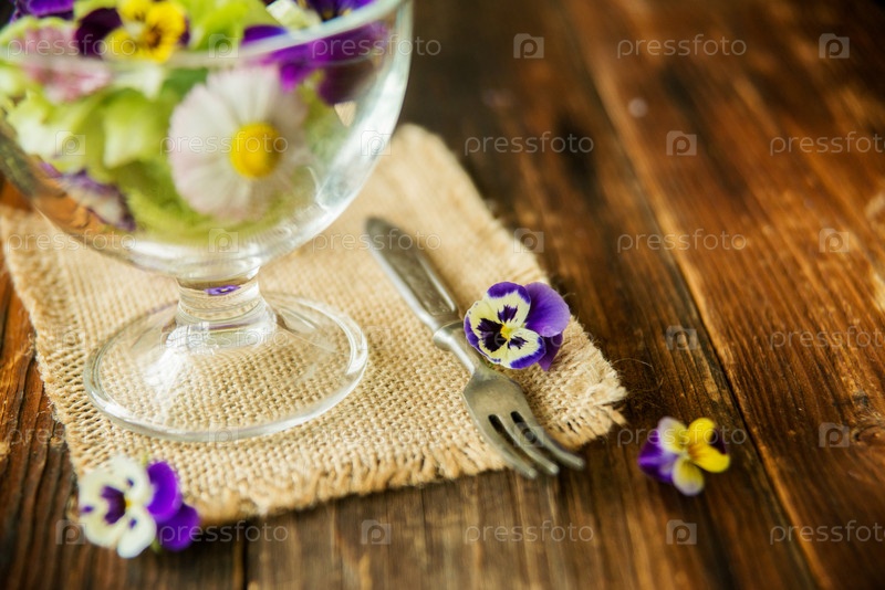 Крупным планом листья салата садовые травы и съедобные цветы. Здоровое питание