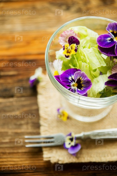 Крупным планом листья салата садовые травы и съедобные цветы. Здоровое питание