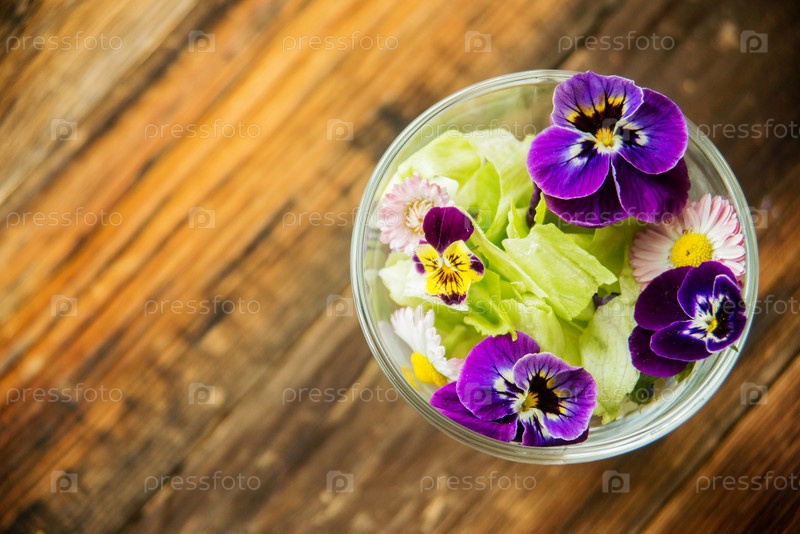 Свежий зеленый салат с травами и садовыми цветами. Концепция здоровой еды