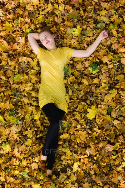 Красивая девушка лежит на осенней листве
