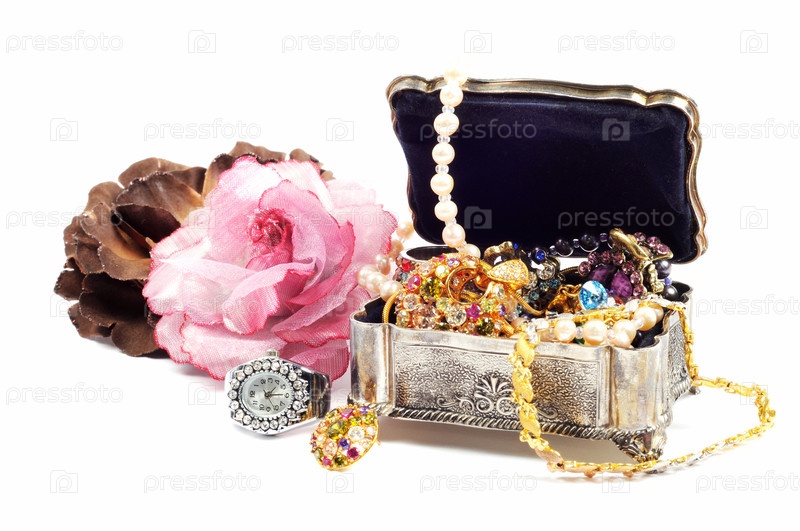 Аксессуары и золотые ювелирные изделия в серебряной шкатулке на белом фоне