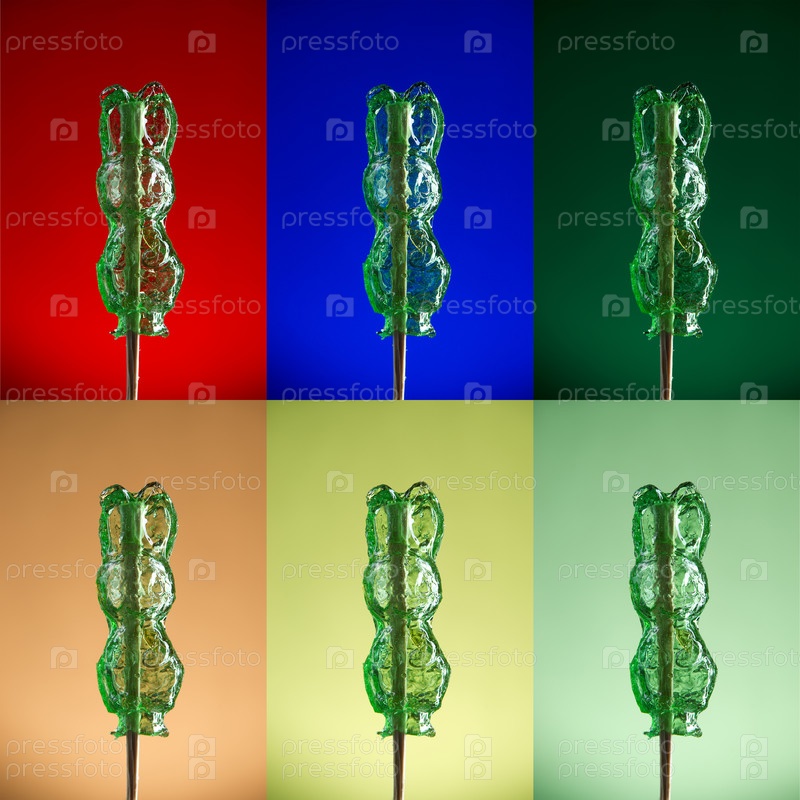 Сахарный леденец на палочке в форме кролика на цветных фонах