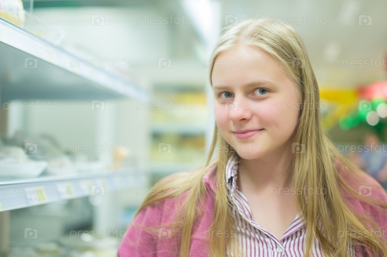 Молодая женщина возле полки в супермаркете