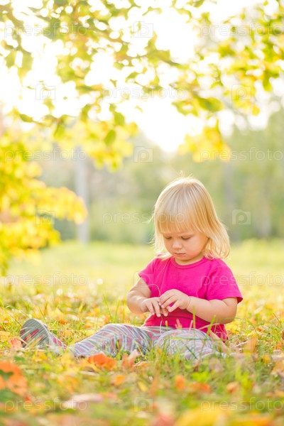 Прелестный ребенок сидит на траве в тени деревьев на закате