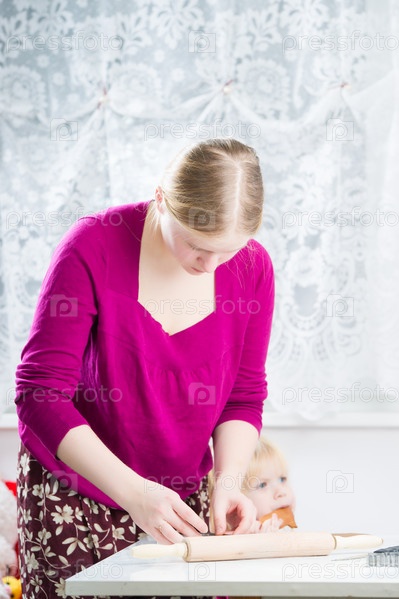 Ребенок помогает матери печь пряники в кухне