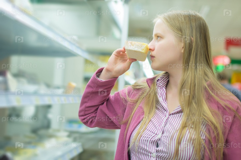 Молодая женщина возле полки с сыром в супермаркете