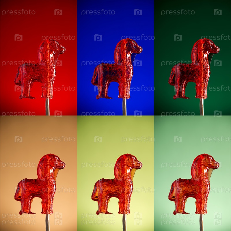 Сахарный леденец на палочке в форме лошади на цветных фонах