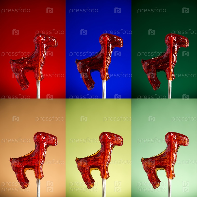 Сахарный леденец на палочке в форме собаки на цветных фонах