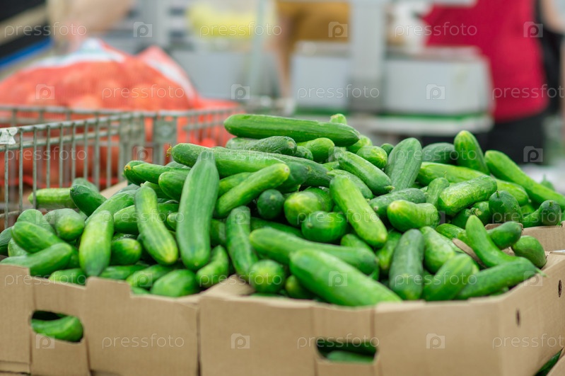 Длинные огурцы в ящиках в супермаркете
