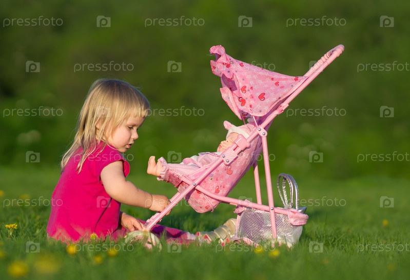 Очаровательная девочка играет с куклой в коляске на зеленой траве