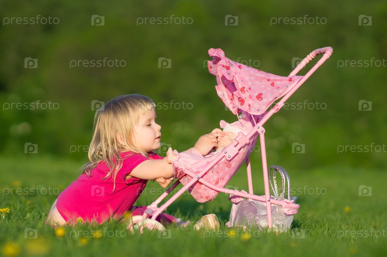 Очаровательная девочка играет с куклой в коляске на зеленой траве