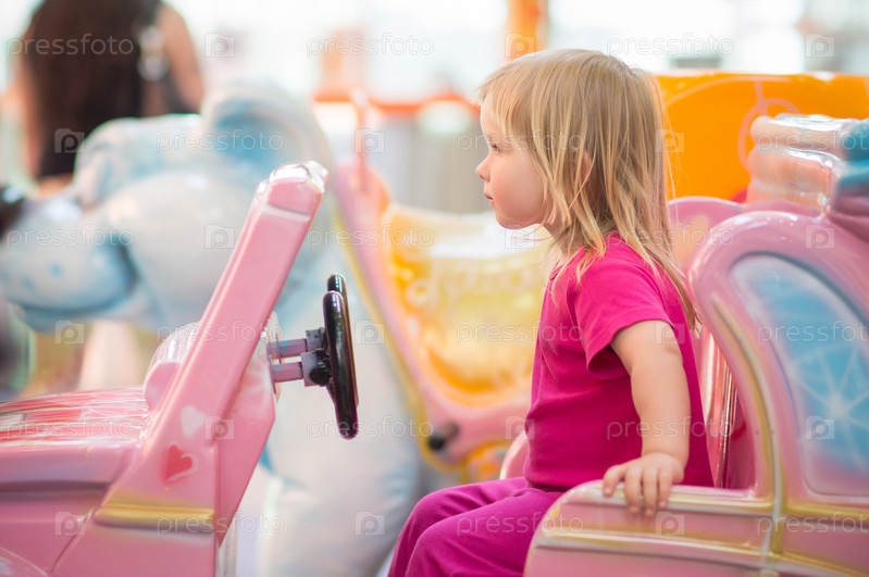 Прелестный ребенок катается на карусели в торговом центре