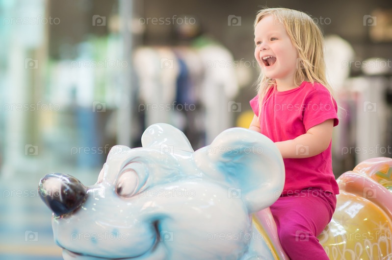 Прелестный ребенок катается на карусели в торговом центре