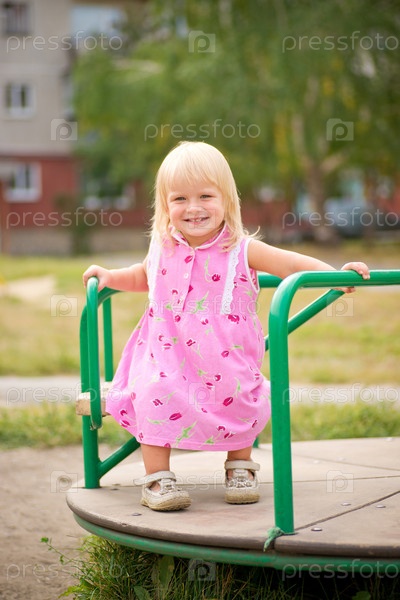 Прелестный ребенок кружится на карусели на детской площадке