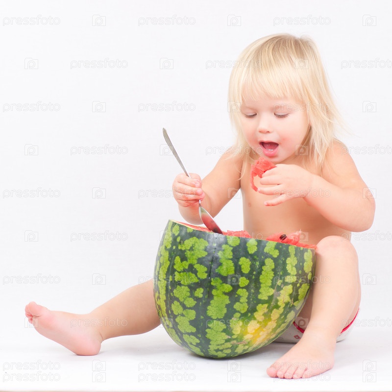 Прелестный ребенок сидит и ест арбуз ложкой на белом фоне