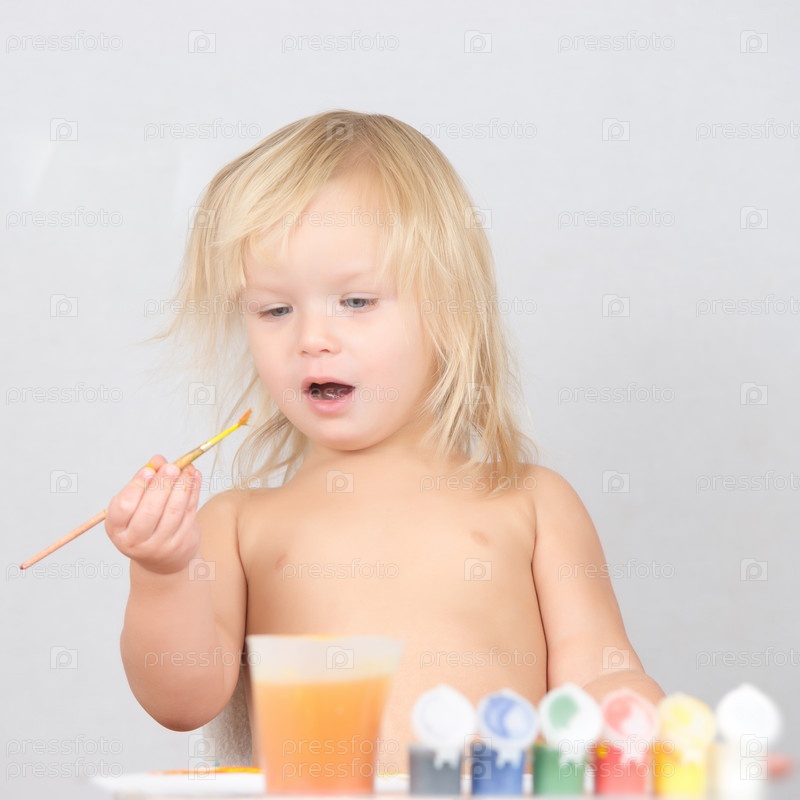 Прелестный ребенок рисует красками на бумаге, сидя за столом на белом фоне