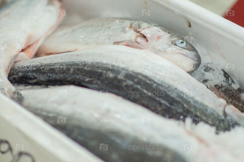 Свежезамороженная рыба лежит на льду в супермаркете