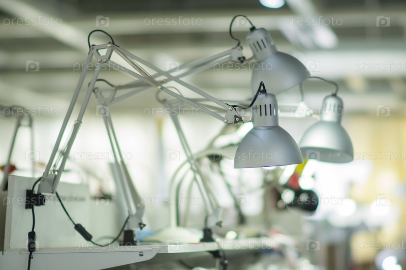 Разнообразные настольные лампы на полках в торговом центре