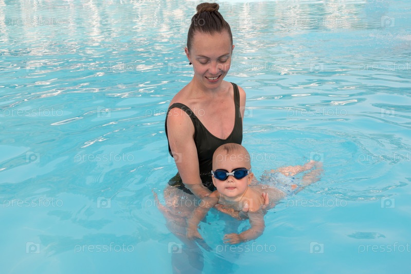 Женщина учит ребенка плавать