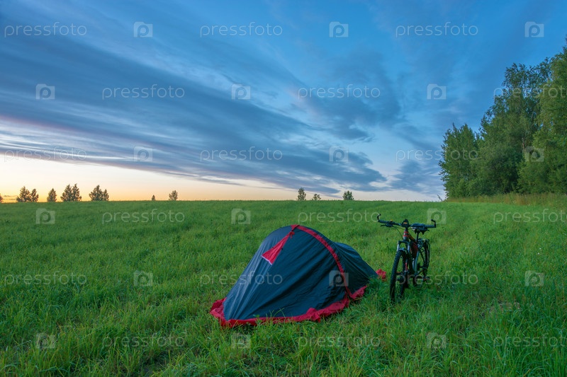 Палатка и велосипед в поле