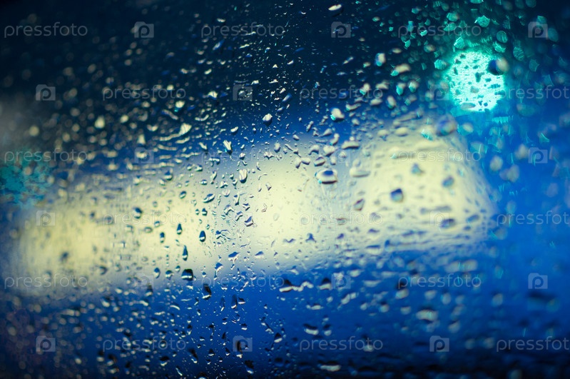 Синий фон с огнями и дождевыми каплями на стекле