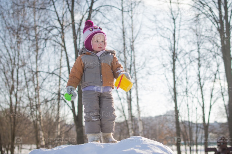 Очаровательный ребенок копает снег совком на зимней детской площадке