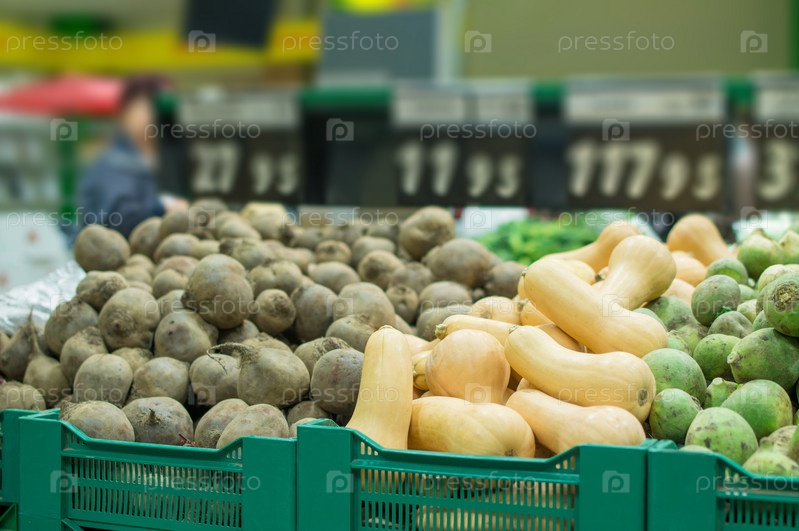 Зеленая редька, свекла и небольшие тыквы в ящиках в супермаркете