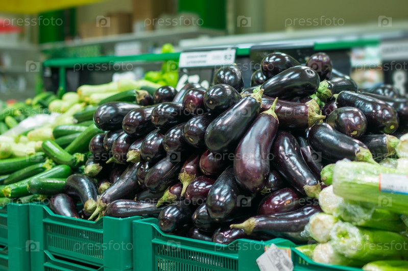 Баклажаны и цуккини в ящиках в супермаркете