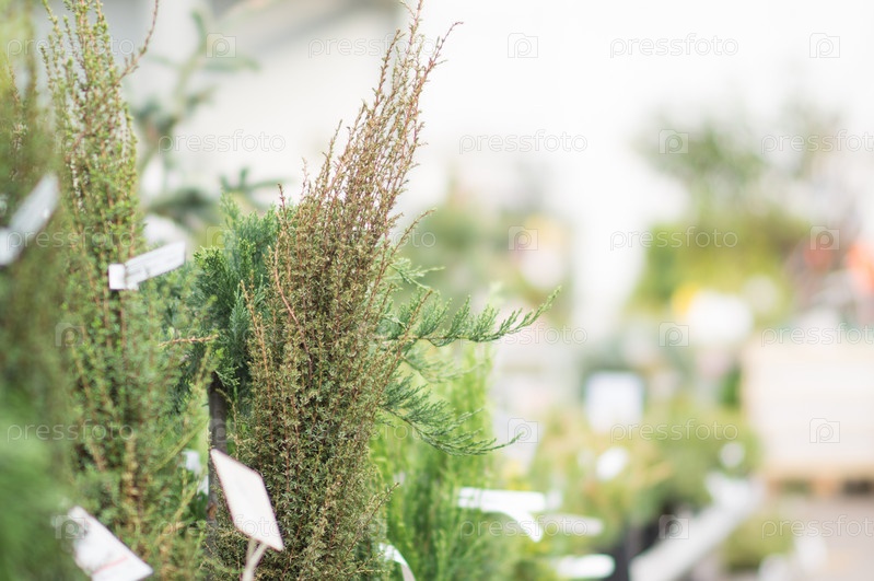 Разнообразные растения на полках в торговом центре
