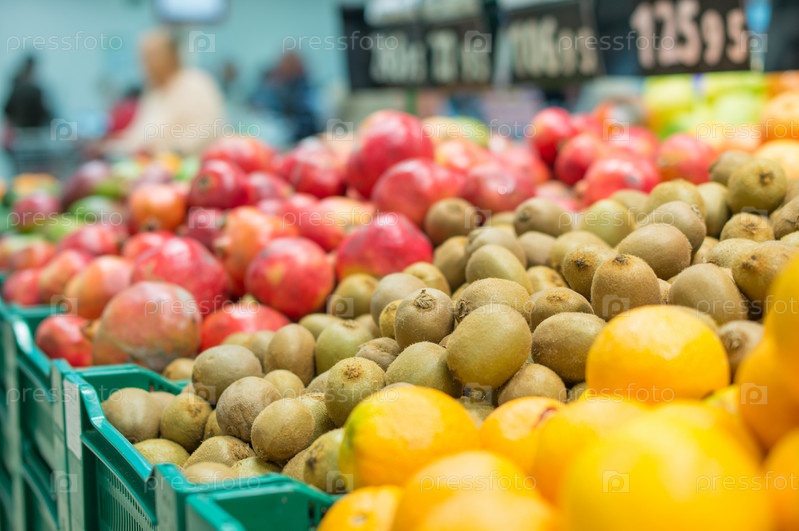 Киви и гранаты в ящиках в супермаркете