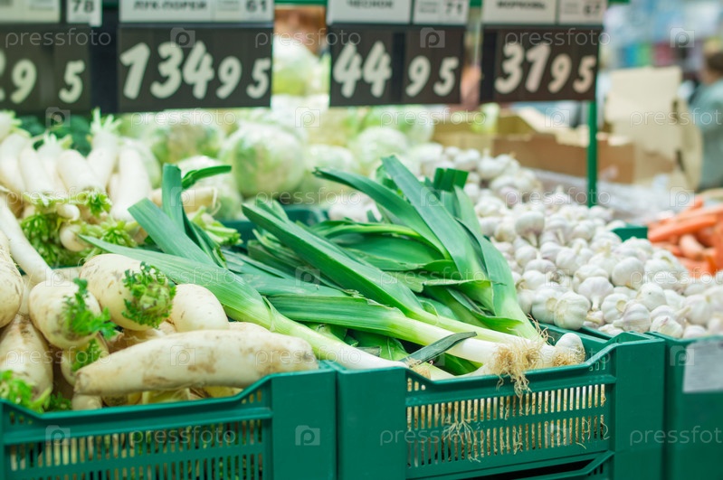 Дайкон, лук-порей и чеснок в ящиках в супермаркете