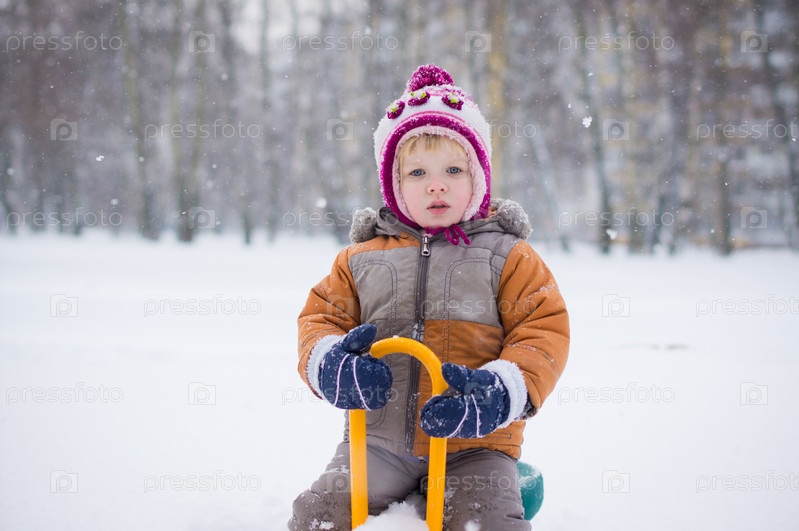 Очаровательный ребенок на качели на зимней детской площадке