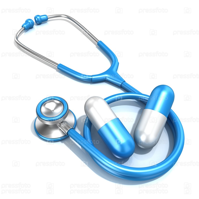 Синий стетоскоп с двумя большими голубыми таблетками