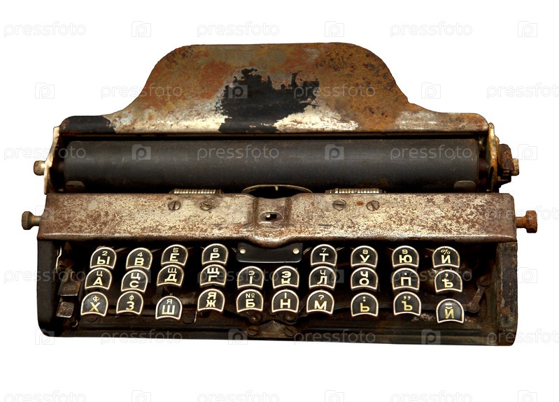 Печатная машинка прошлого века с русской клавиатурой, изолированная на белом фоне