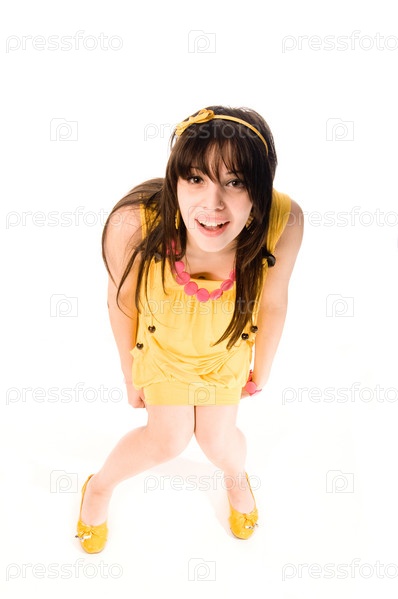 Девушка в желтом платье на белом фоне