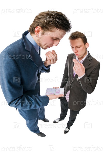 Двое молодых предпринимателей с большим количеством денежных средств на белом фоне
