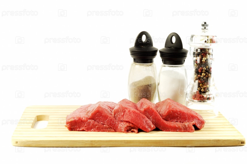 Свежий сырой бифштекс со специями на деревянной доске на белом фоне