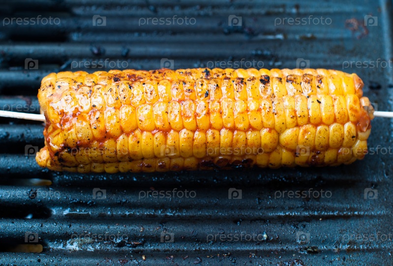 Кукурузный початок на шпажке обжаривается на гриле