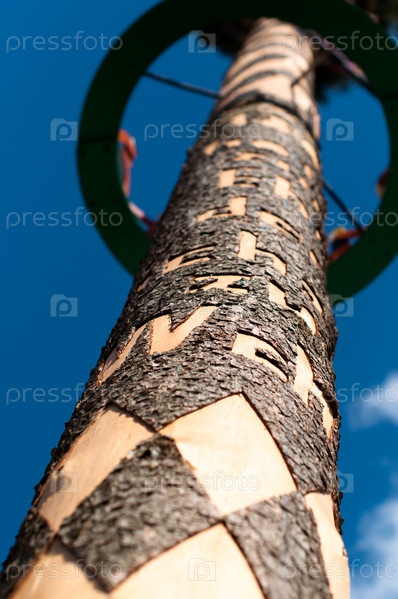 Майское дерево с украшениями и гравировкой на фоне неба