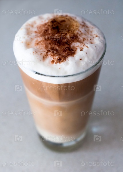 Кофе латте с какао-порошком в высоком стакане на светлом фоне