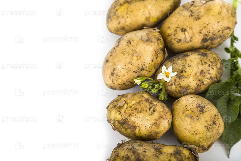 Сырой картофель с листьями на белом фоне