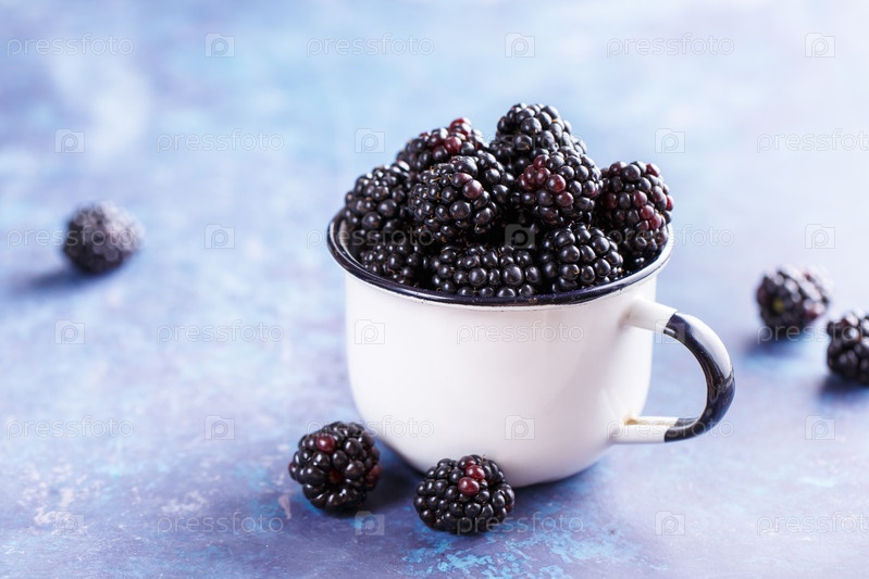 Сочная свежая ежевика в кружке на синем фоне фокус